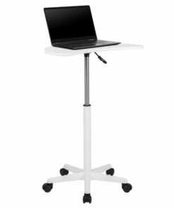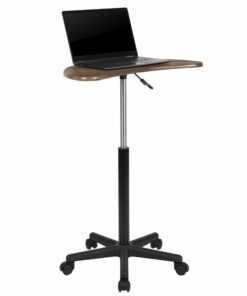 Zip around with ease with this handy little desk that can be used while working on your laptop or as a speakers’ lectern. It features a half-moon shaped desktop in a Rustic Walnut laminate finish that’s height adjustable, allowing you to complete tasks while sitting down or standing up. Raise and lower the desktop using the conveniently located pneumatic frame height adjustment lever. The heavy-duty, nylon base with dual wheel casters allow you to roll across all flooring. Undo unhealthy work habits with the Maple Sit to Stand Mobile Laptop Computer Desk that offers a versatile workspace on wheels for your home or office.